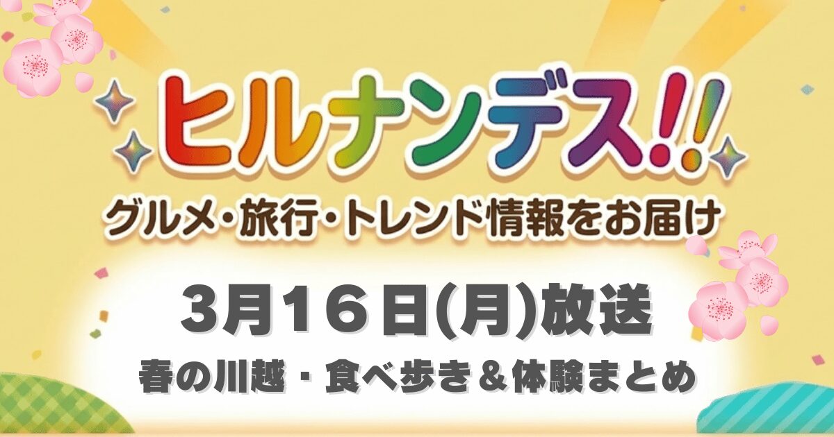 3月16日放送のヒルナンデスは「春の川越」特集! 創業100年を超える老舗の限定スイーツから、自分で焼けるお煎餅体験まで。 春休みのお出かけにぴったりな最新スポットをご紹介します。